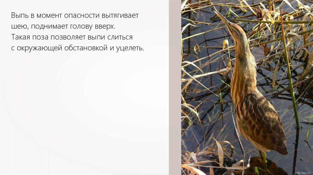 Выпь в момент опасности вытягиваетшею, поднимает голову вверх.