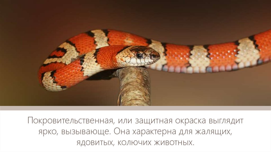 Покровительственная, или защитная окраска выглядитярко, вызывающе. Она характерна для жалящих,