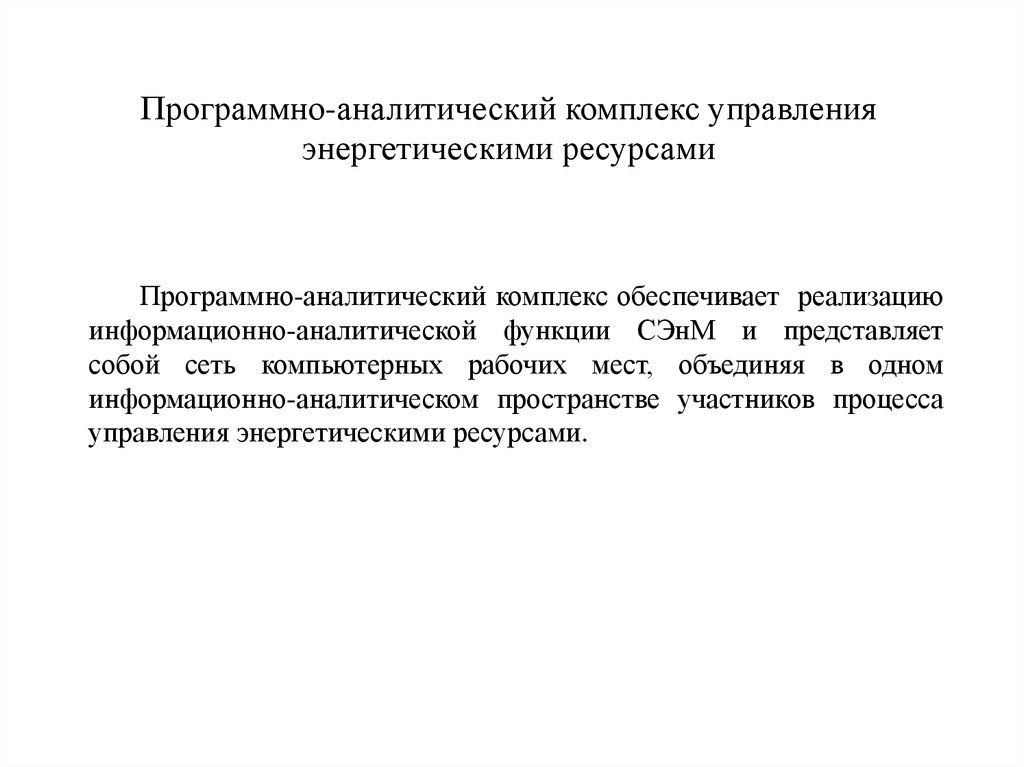 Программно-аналитический комплекс обеспечивает реализациюинформационно-аналитической функции СЭнМ и представляет