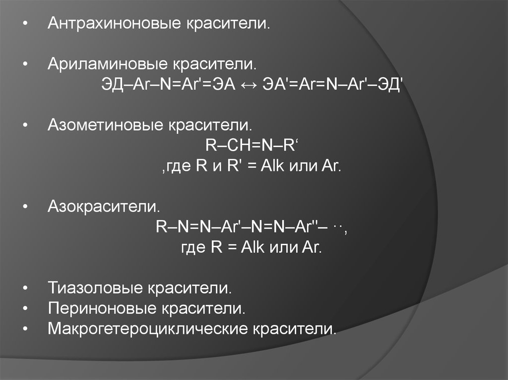 Ариламиновые красители делятся на следующие группы:ариламиновые (хинониминовые), оксазиновые, тиазиновые и