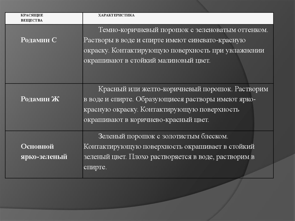 в воде и спирте. Образующиеся растворы имеют яркокрасную окраску. Контактирующую поверхность
