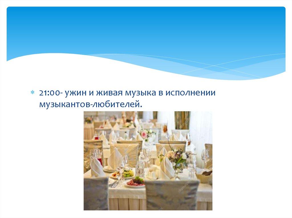 21:00- ужин и живая музыка в исполнениимузыкантов-любителей.