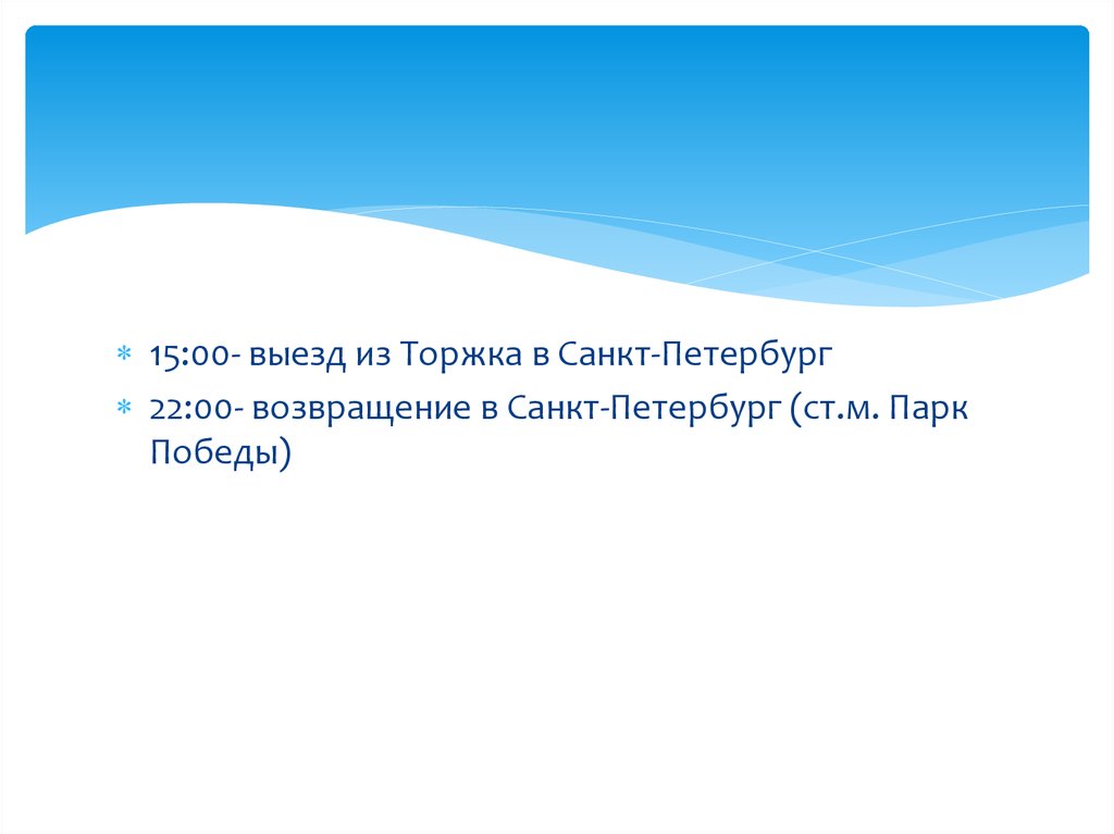 15:00- выезд из Торжка в Санкт-Петербург22:00- возвращение в Санкт-Петербург (ст.м. Парк
