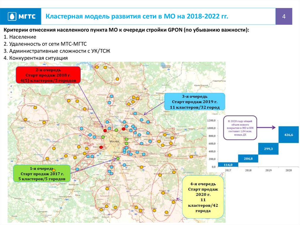 Кластерная модель развития сети в МО на 2018-2022 гг.Критерии отнесения населенного пункта МО к очереди стройки GPON (по убыванию важности):