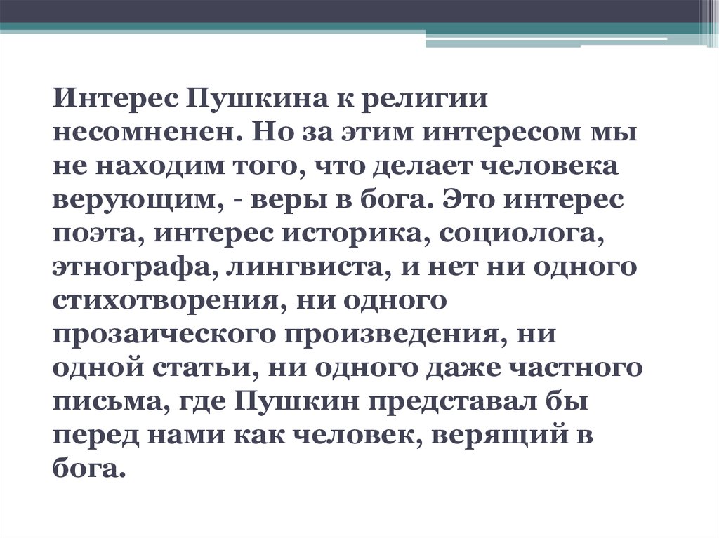 Интерес Пушкина к религиинесомненен. Но за этим интересом мы