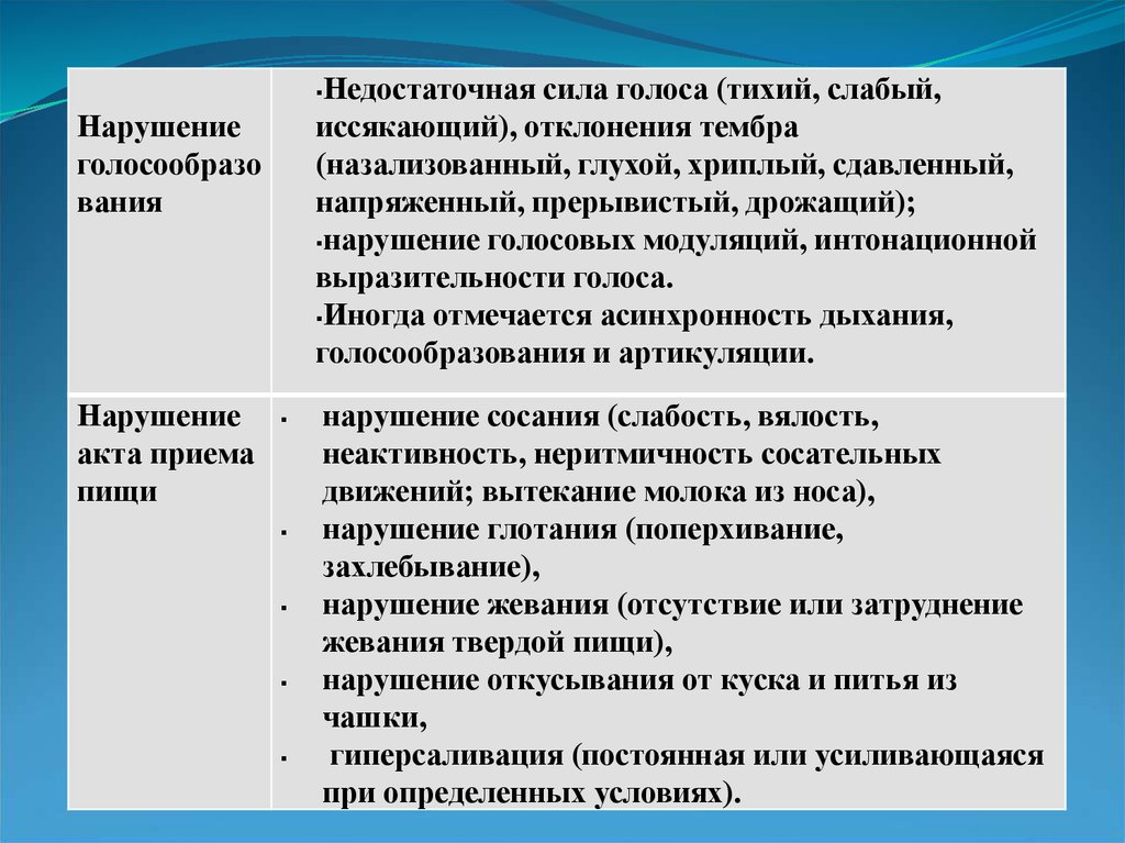 Недостаточная сила голоса (тихий, слабый,иссякающий), отклонения тембра
