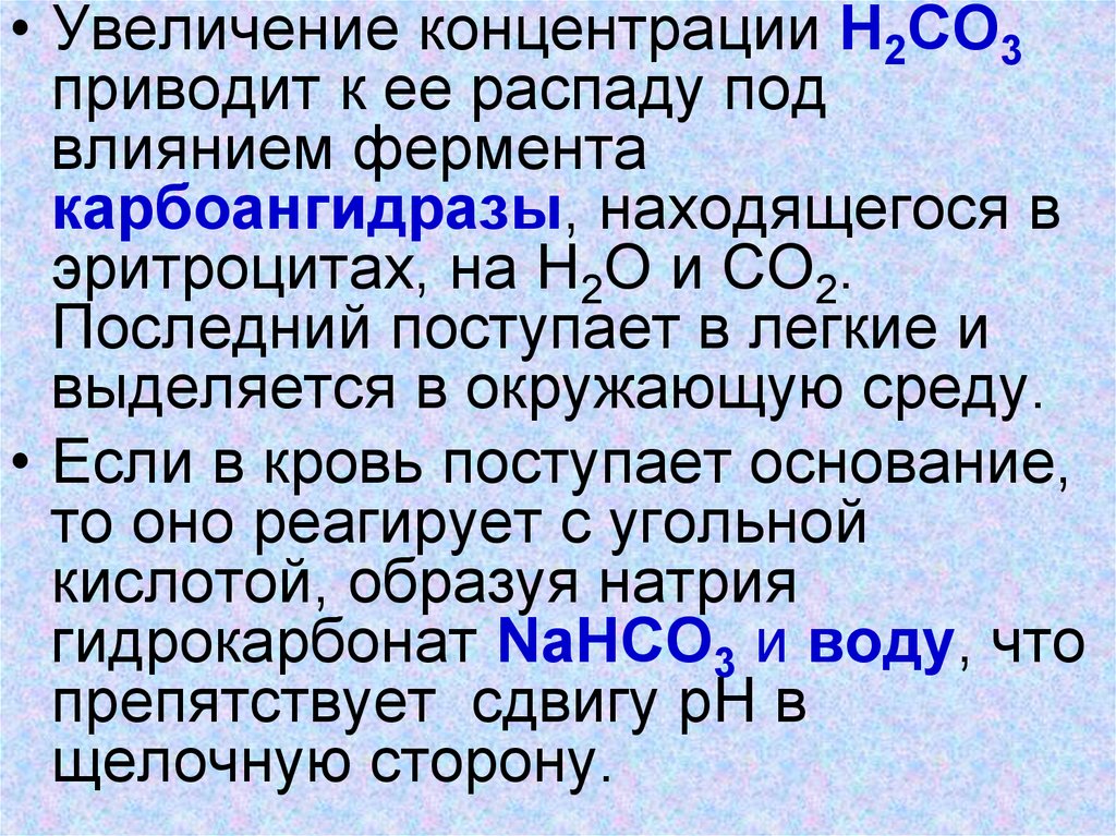 • Увеличение концентрации Н2СО3приводит к ее распаду под