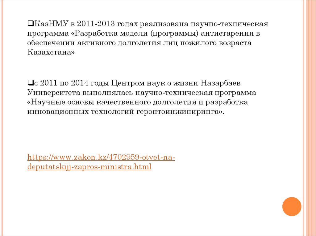 КазНМУ в 2011-2013 годах реализована научно-техническаяпрограмма «Разработка модели (программы) антистарения в