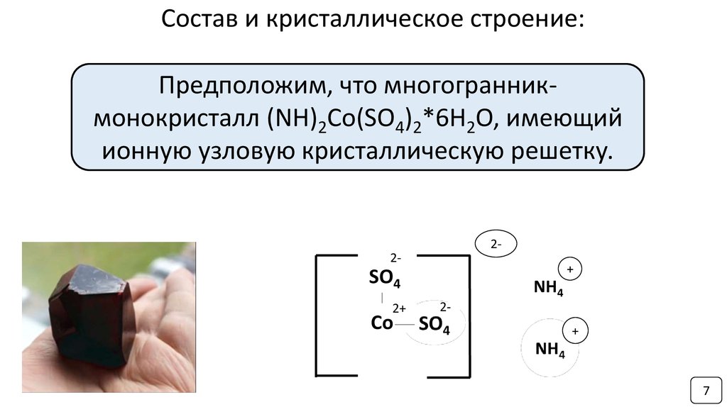 Состав и кристаллическое строение:Предположим, что многогранникмонокристалл (NH)2Co(SO4)2*6H2O, имеющий