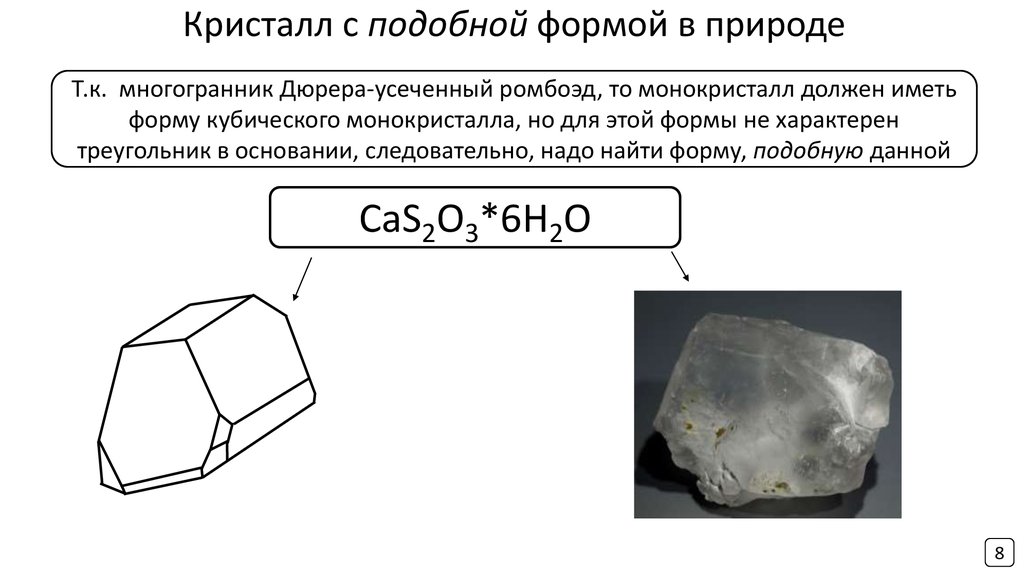 Кристалл с подобной формой в природеТ.к. многогранник Дюрера-усеченный ромбоэд, то монокристалл должен иметь