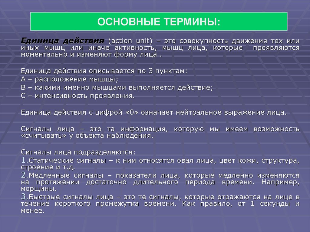 ОСНОВНЫЕ ТЕРМИНЫ:Единица действия (action unit) – это совокупность движения тех или