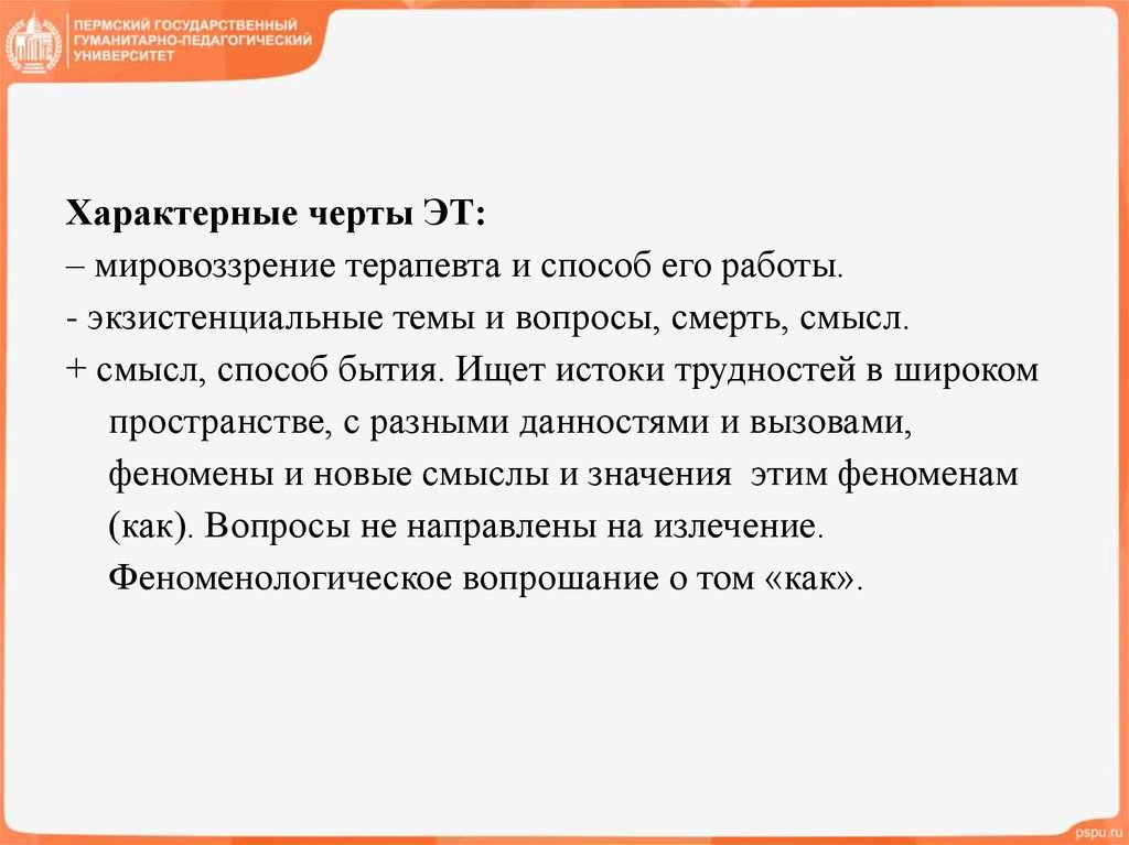 Характерные черты ЭТ:– мировоззрение терапевта и способ его работы.