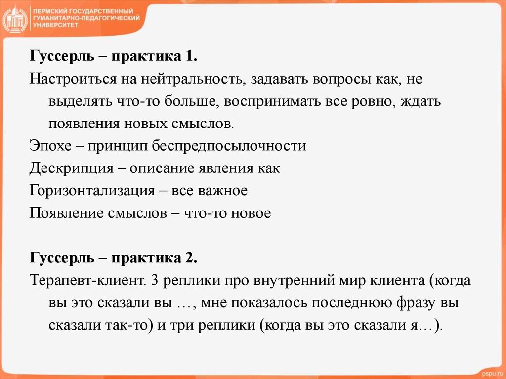 Гуссерль – практика 1.Настроиться на нейтральность, задавать вопросы как, не