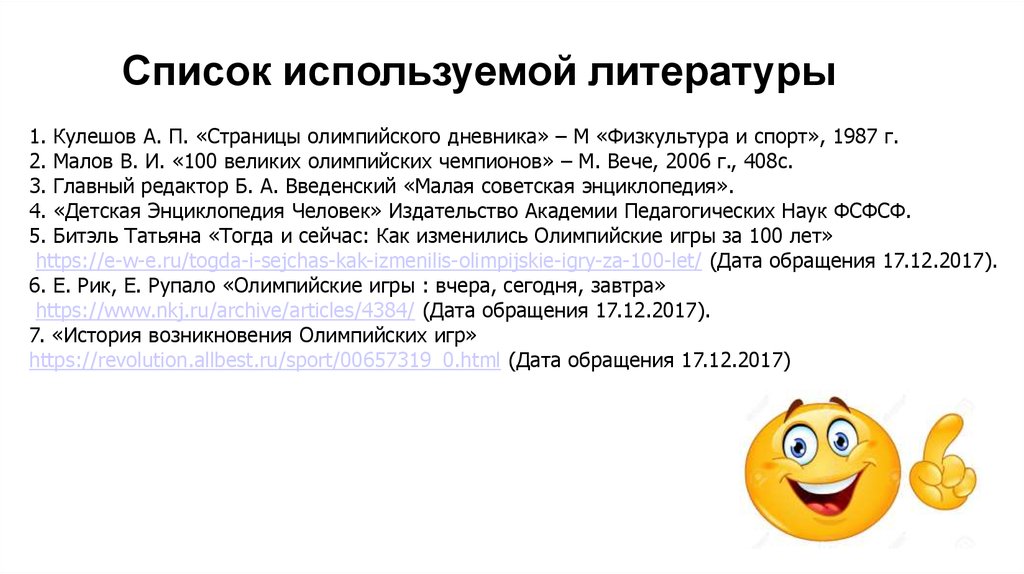 Список используемой литературы1. Кулешов А. П. «Страницы олимпийского дневника» – М «Физкультура и спорт», 1987 г.