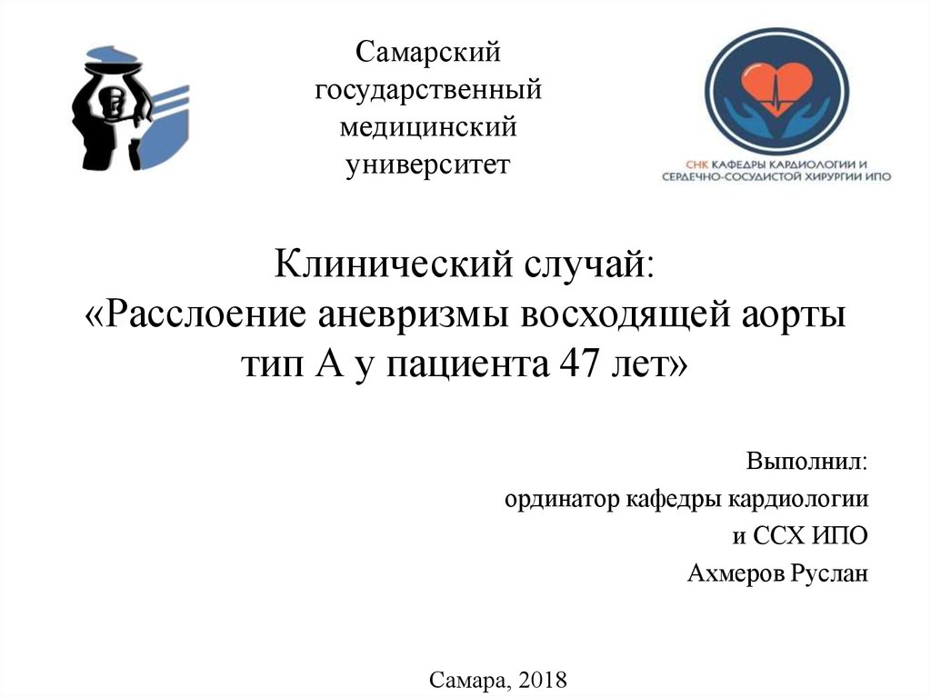 1. Клинический случай: «Расслоение аневризмы восходящей аорты тип А у пациента 47 лет»
