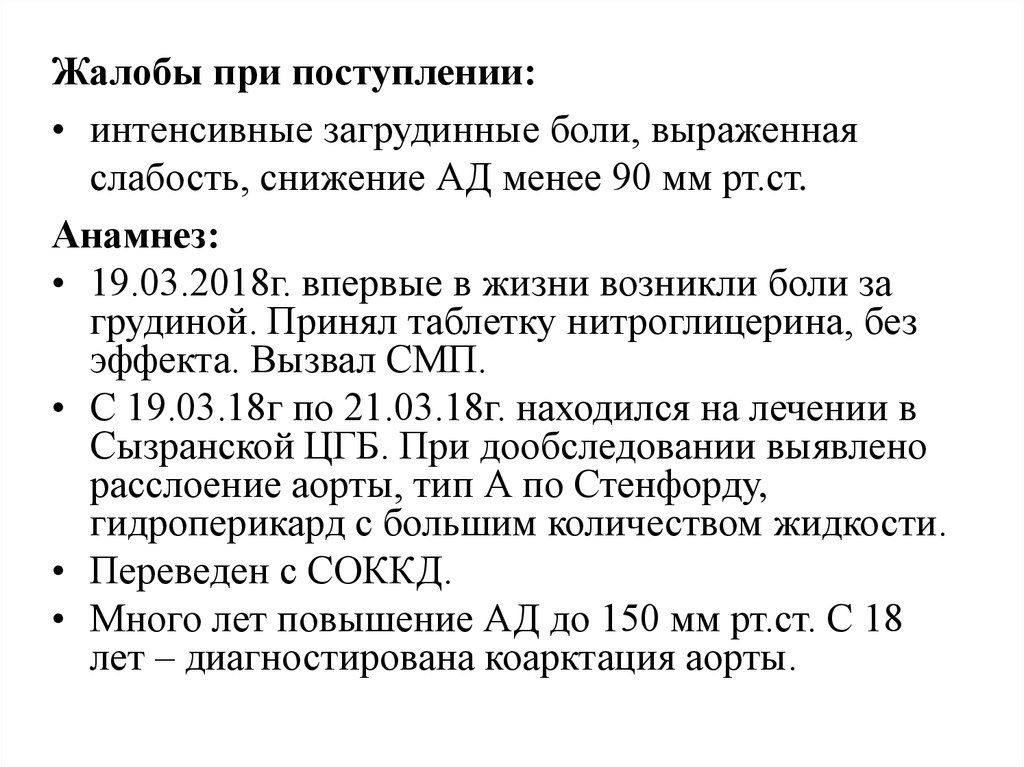 Жалобы при поступлении:• интенсивные загрудинные боли, выраженная