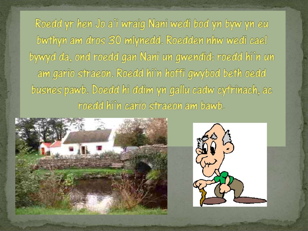 yn byw ymysg y pys!’ Yna, fe aeth â Nani at yr afon.