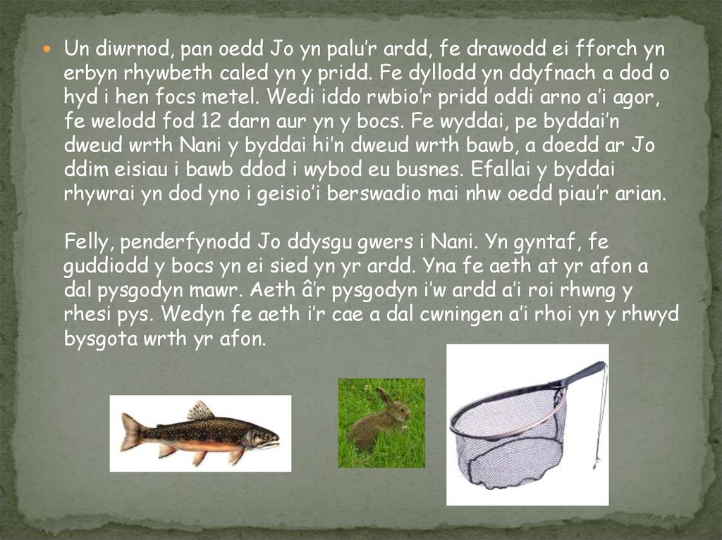 pysgodyn a’r gwningen erbyn hynny. Doedd dim