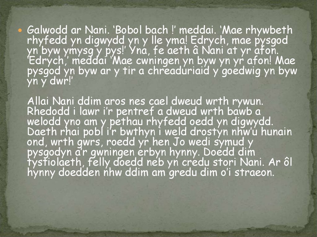 Galwodd ar Nani. ‘Bobol bach !’ meddai. ‘Mae rhywbethrhyfedd yn digwydd yn y lle yma! Edrych, mae pysgod