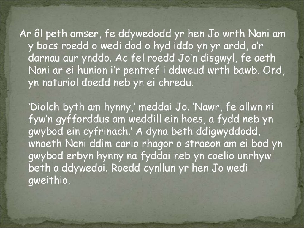 Ar ôl peth amser, fe ddywedodd yr hen Jo wrth Nani amy bocs roedd o wedi dod o hyd iddo yn yr ardd, a’r