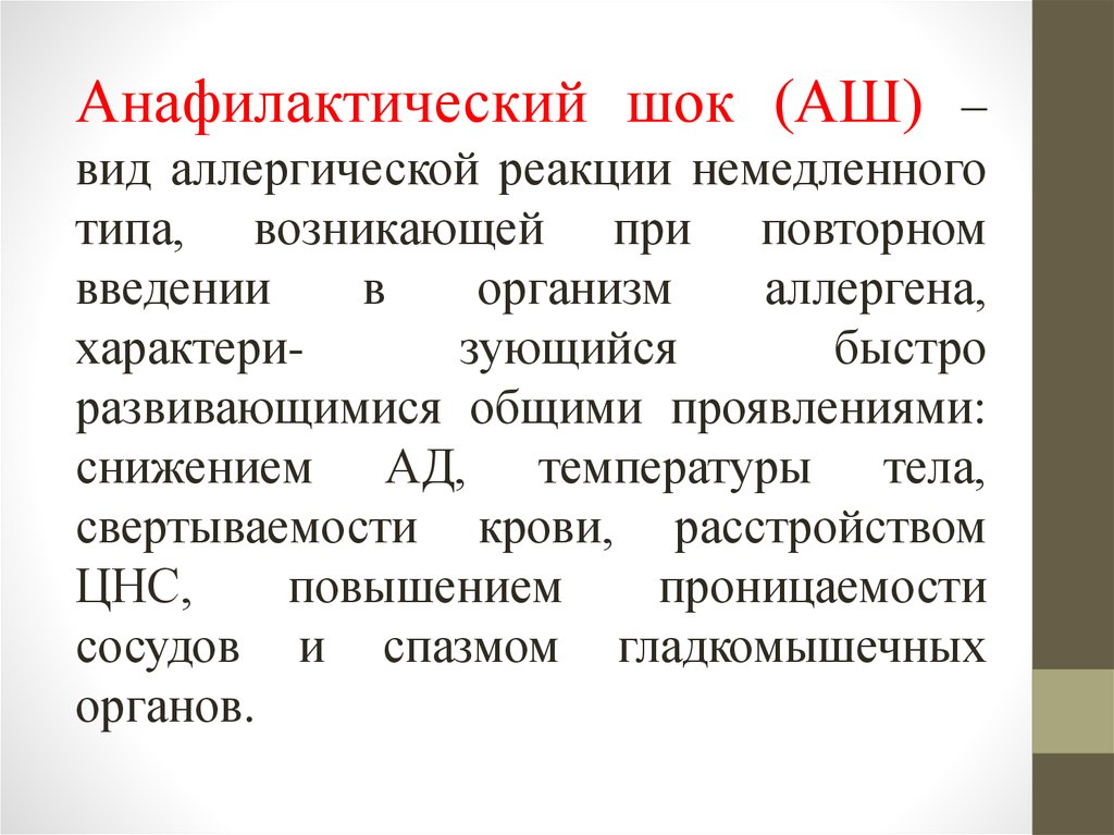Анафилактический шок (АШ) –вид аллергической реакции немедленного