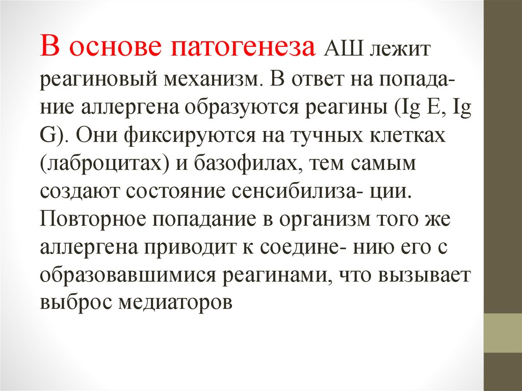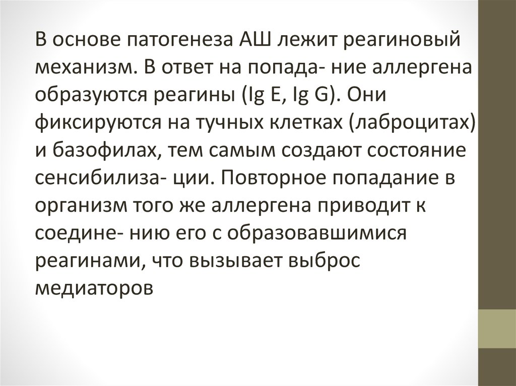 В основе патогенеза АШ лежитреагиновый механизм. В ответ на попадание аллергена образуются реагины (Ig Е, Ig