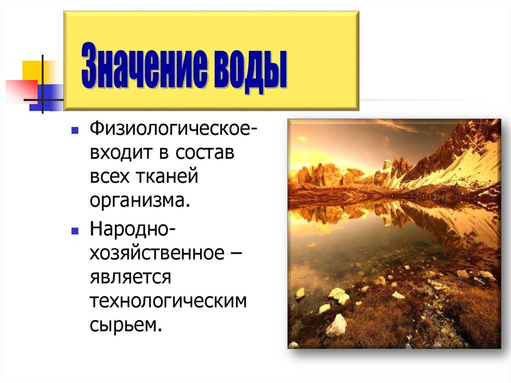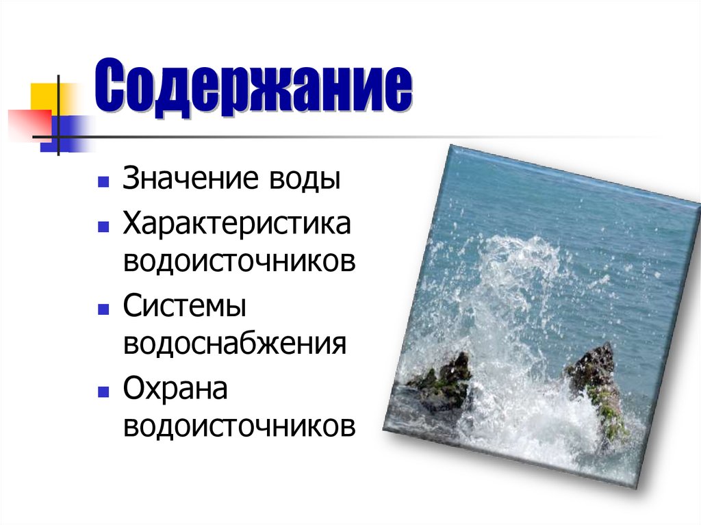 3. Цели: * Показать разнообразие водоисточников в природе. * Показать значение воды для человека.