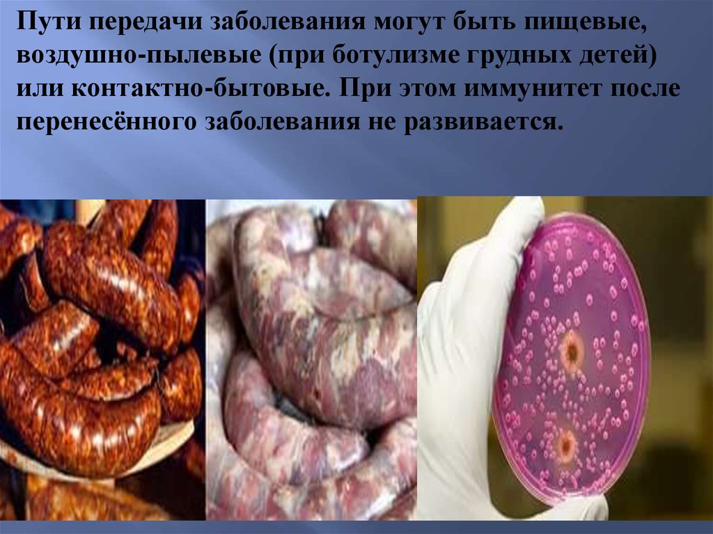 Пути передачи заболевания могут быть пищевые,воздушно-пылевые (при ботулизме грудных детей)