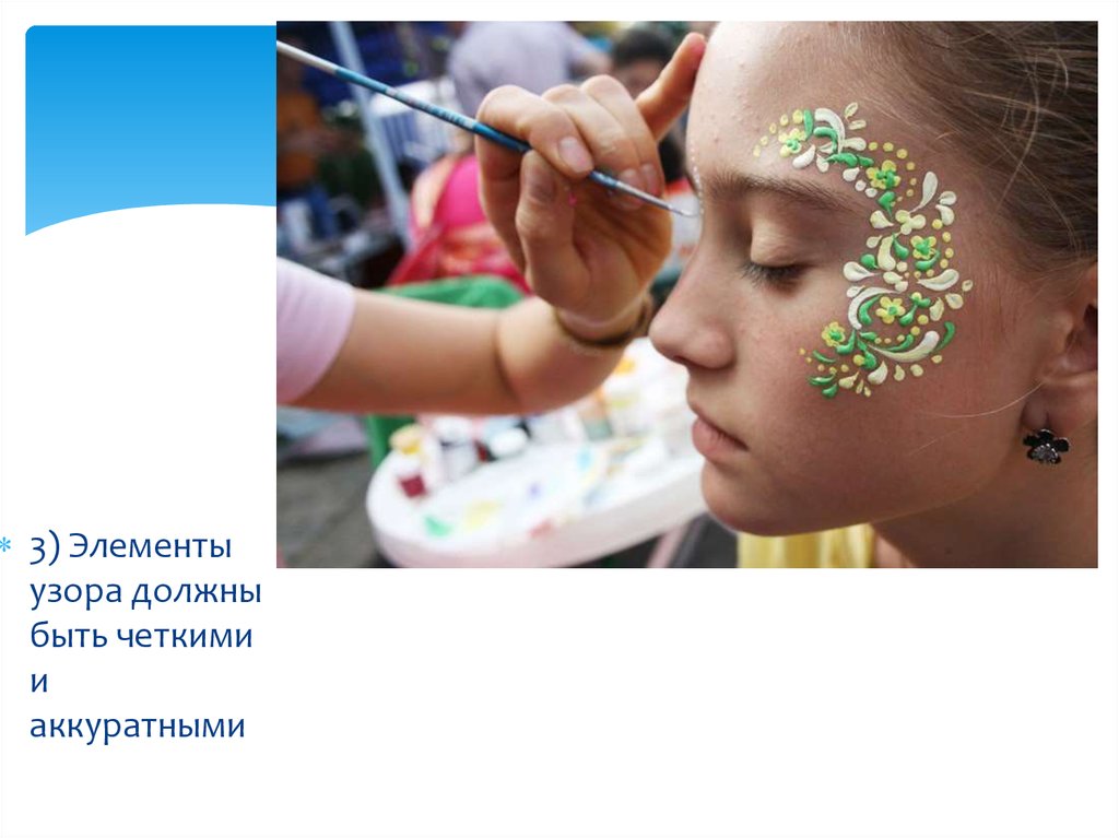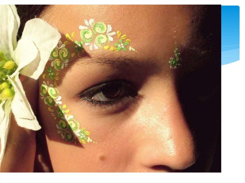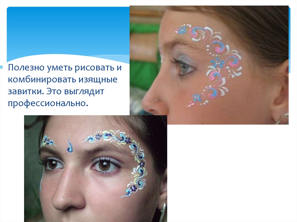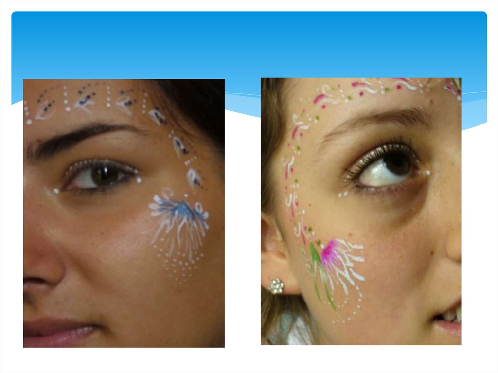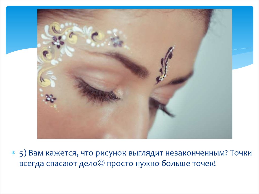 Нарисуйте одним цветом несколько цветочков над бровью, увиска и под глазом. Таким образом мы наметили своего рода