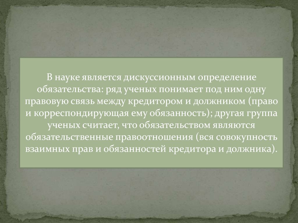 В науке является дискуссионным определениеобязательства: ряд ученых понимает под ним одну