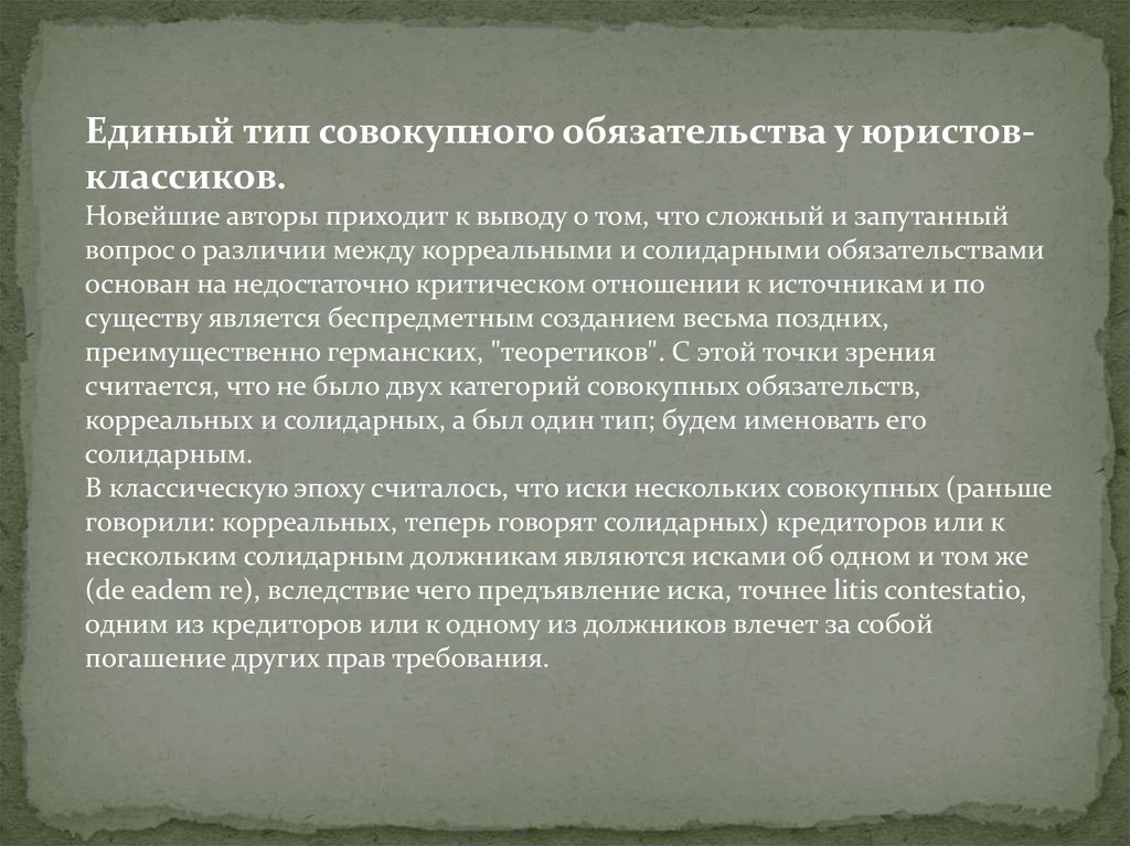 Единый тип совокупного обязательства у юристовклассиков.Новейшие авторы приходит к выводу о том, что сложный и запутанный