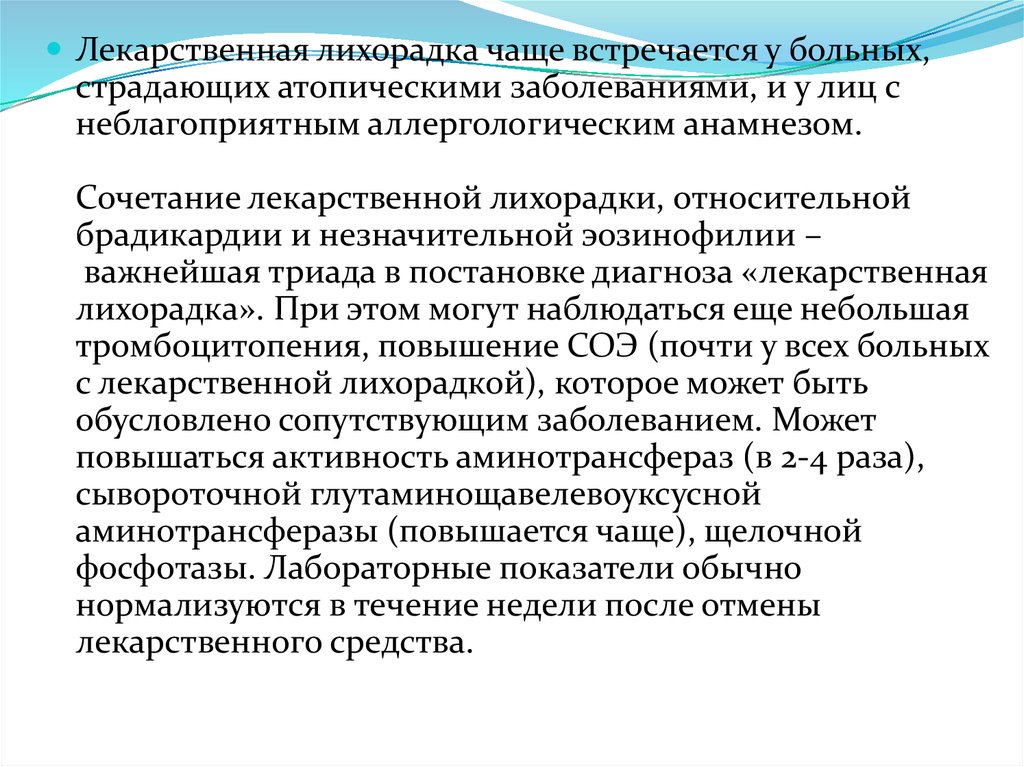 Лекарственная лихорадка чаще встречается у больных,страдающих атопическими заболеваниями, и у лиц с