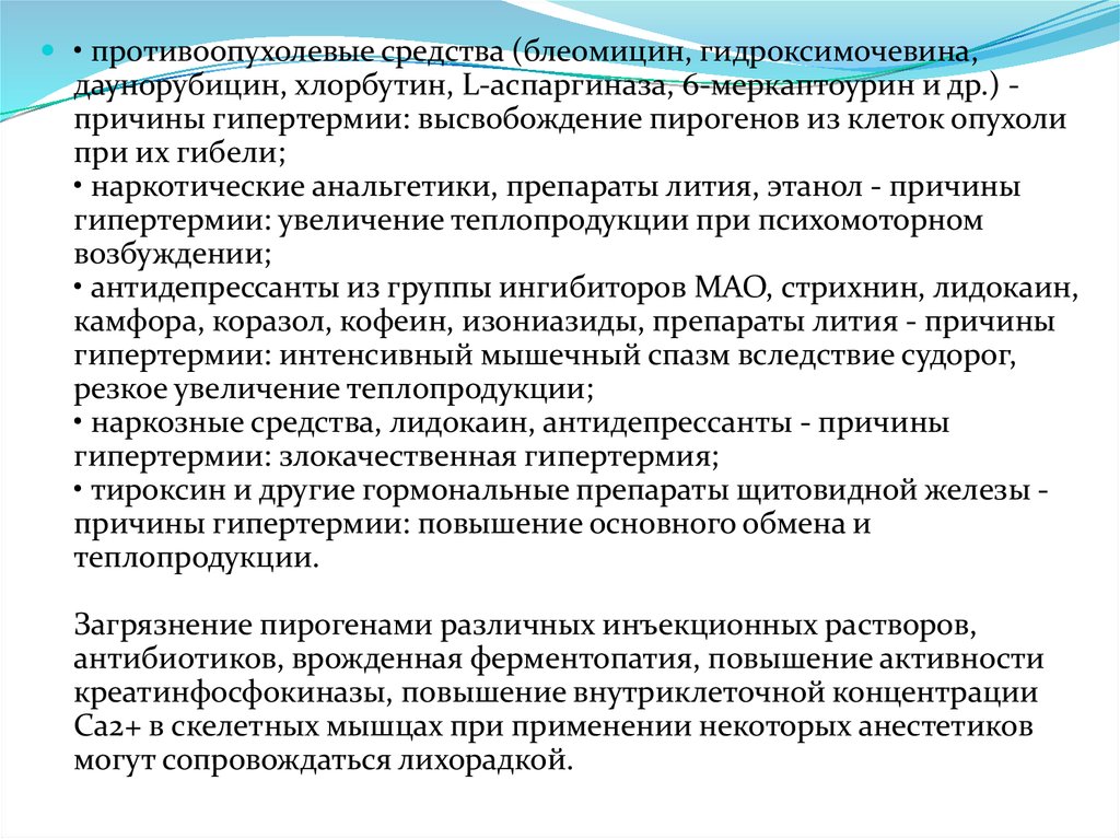 • противоопухолевые средства (блеомицин, гидроксимочевина,даунорубицин, хлорбутин, L-аспаргиназа, 6-меркаптоурин и др.) причины гипертермии: высвобождение пирогенов из клеток опухоли