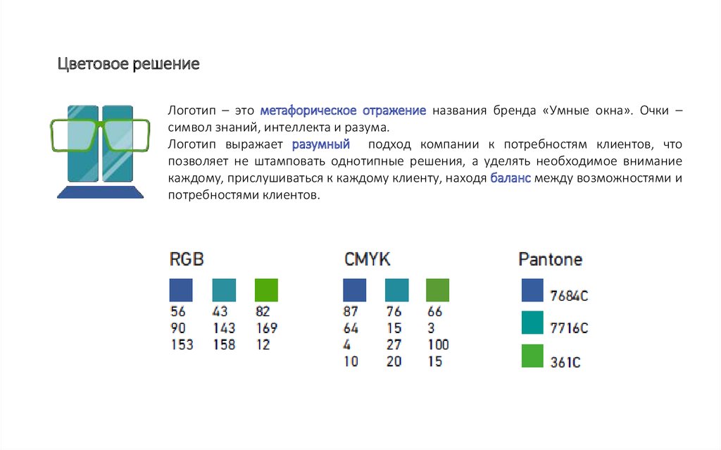 Цветовое решениеЛоготип – это метафорическое отражение названия бренда «Умные окна». Очки –