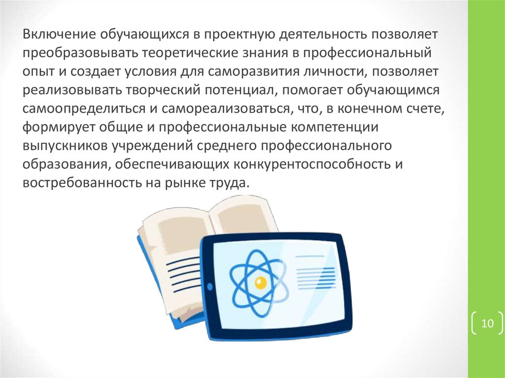 Включение обучающихся в проектную деятельность позволяетпреобразовывать теоретические знания в профессиональный