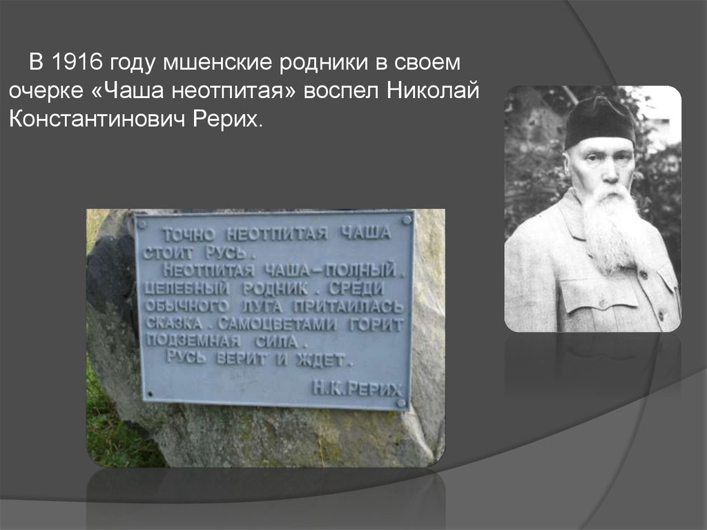 В 1916 году мшенские родники в своемочерке «Чаша неотпитая» воспел Николай
