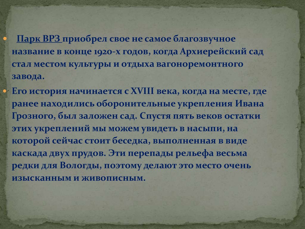 Парк ВРЗ приобрел свое не самое благозвучноеназвание в конце 1920-х годов, когда Архиерейский сад