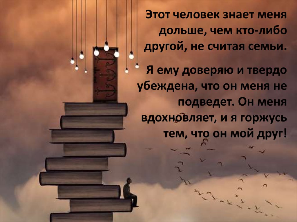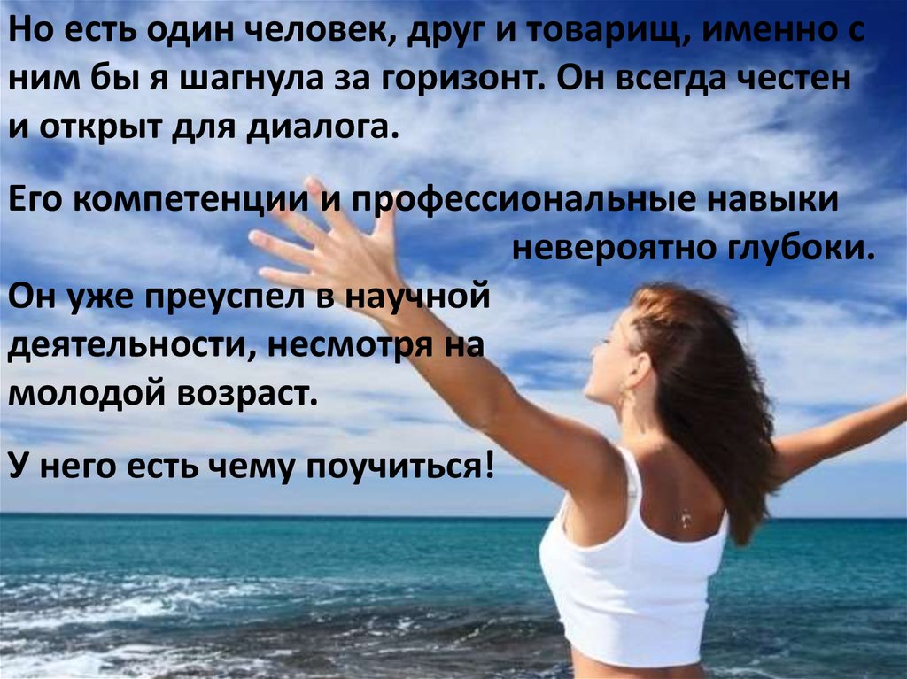 Но есть один человек, друг и товарищ, именно сним бы я шагнула за горизонт. Он всегда честен