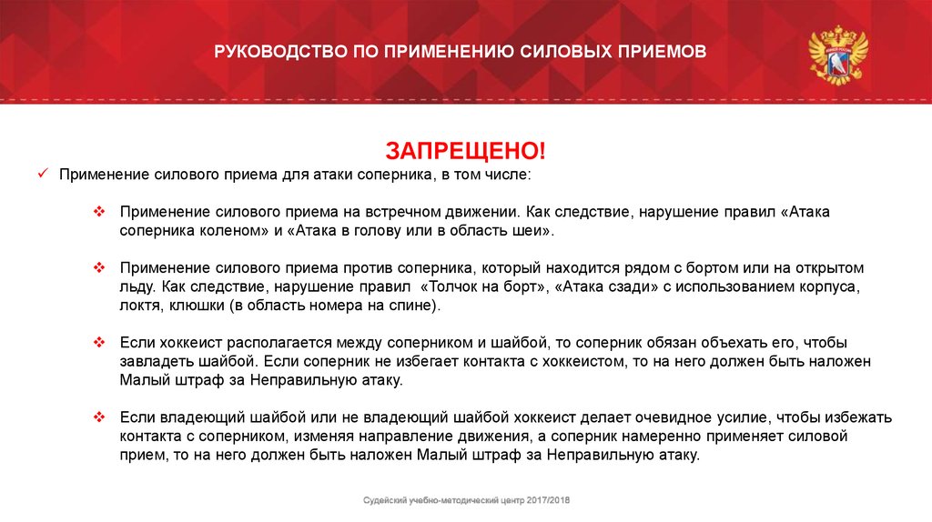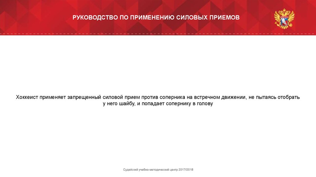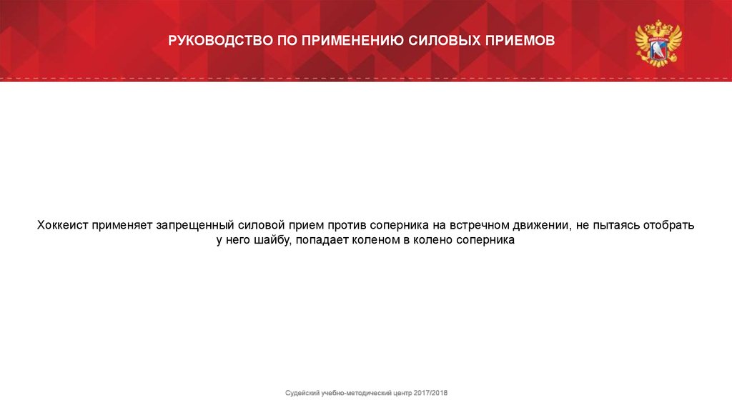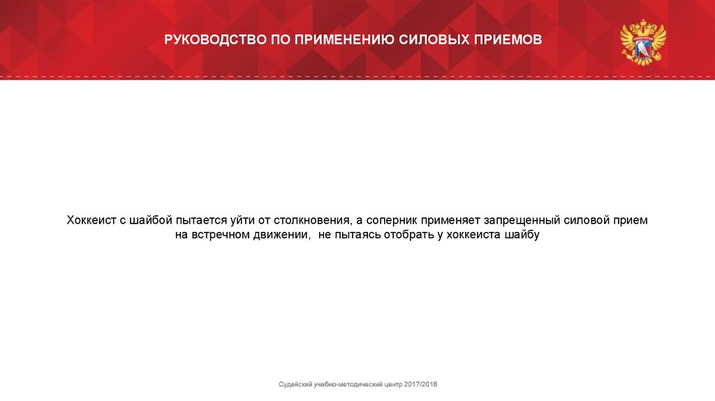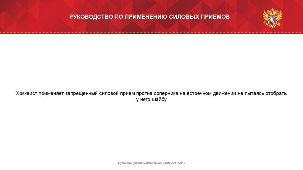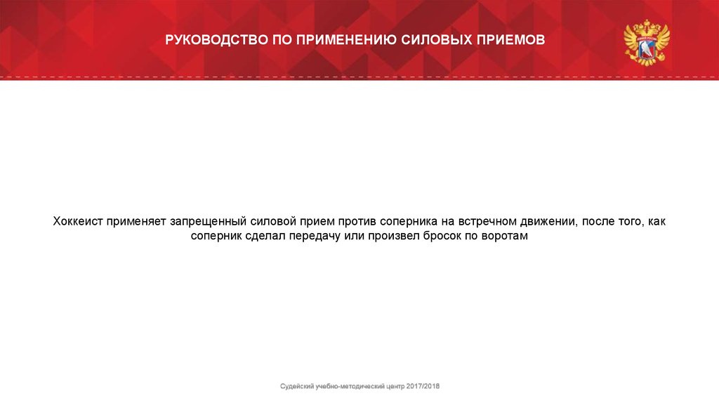РУКОВОДСТВО ПО ПРИМЕНЕНИЮ СИЛОВЫХ ПРИЕМОВХоккеист применяет запрещенный силовой прием против соперника на встречном движении не пытаясь отобрать