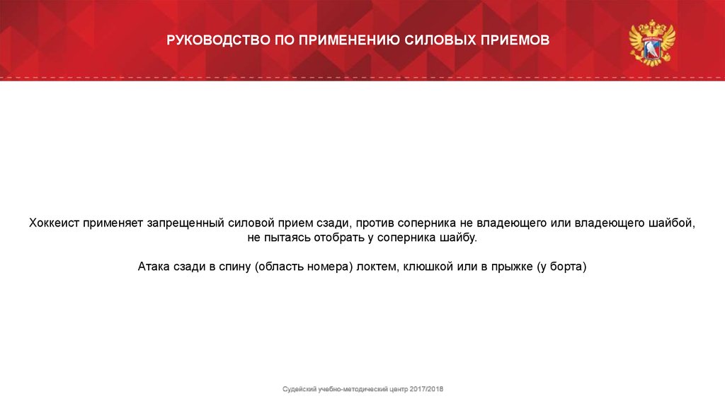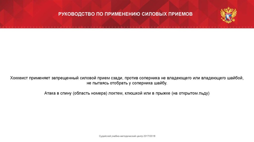 РУКОВОДСТВО ПО ПРИМЕНЕНИЮ СИЛОВЫХ ПРИЕМОВХоккеист применяет запрещенный силовой прием сзади, против соперника не владеющего или владеющего шайбой,
