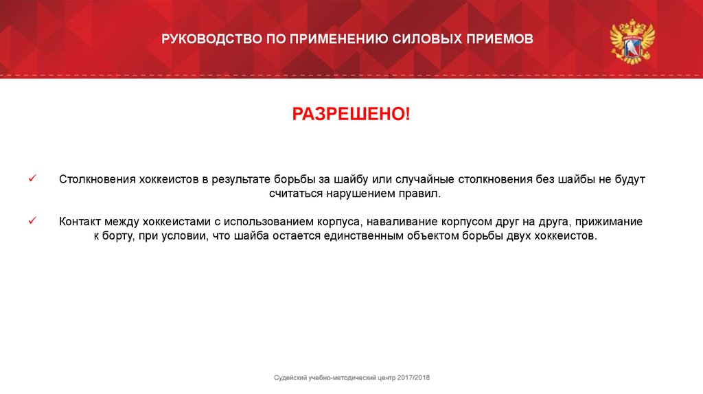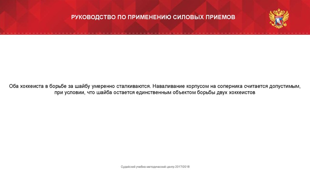 РУКОВОДСТВО ПО ПРИМЕНЕНИЮ СИЛОВЫХ ПРИЕМОВОба хоккеиста в борьбе за шайбу умеренно сталкиваются. Наваливание корпусом на соперника считается допустимым,