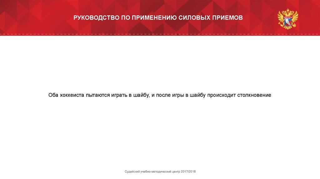 РУКОВОДСТВО ПО ПРИМЕНЕНИЮ СИЛОВЫХ ПРИЕМОВОба хоккеиста пытаются играть в шайбу, и после игры в шайбу происходит столкновение