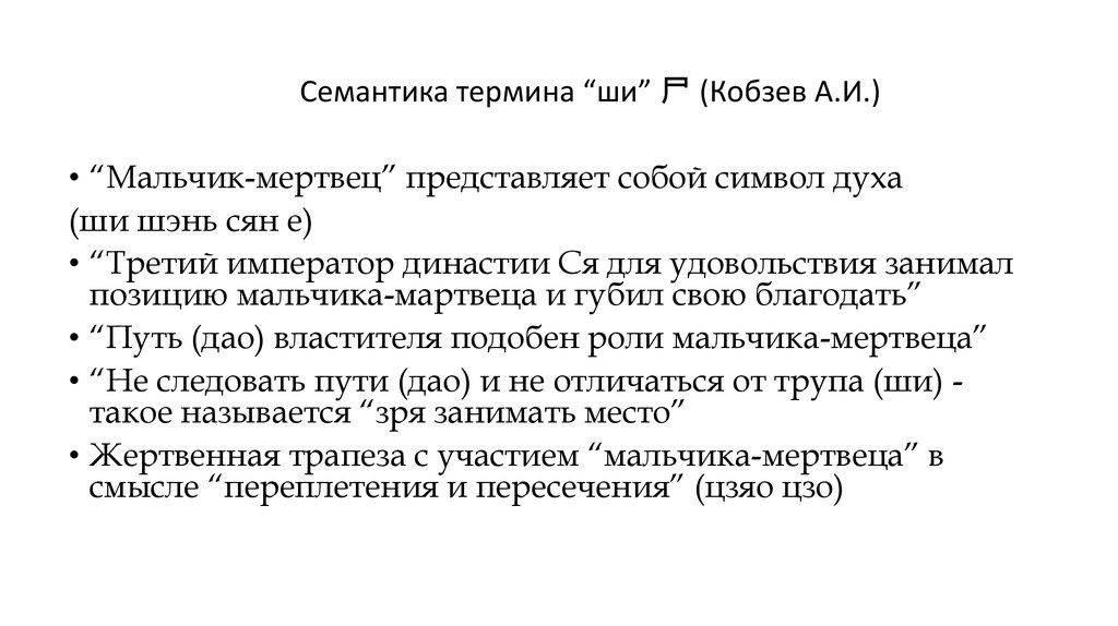 Семантика термина “ши” 尸 (Кобзев А.И.)• “Мальчик-мертвец” представляет собой символ духа