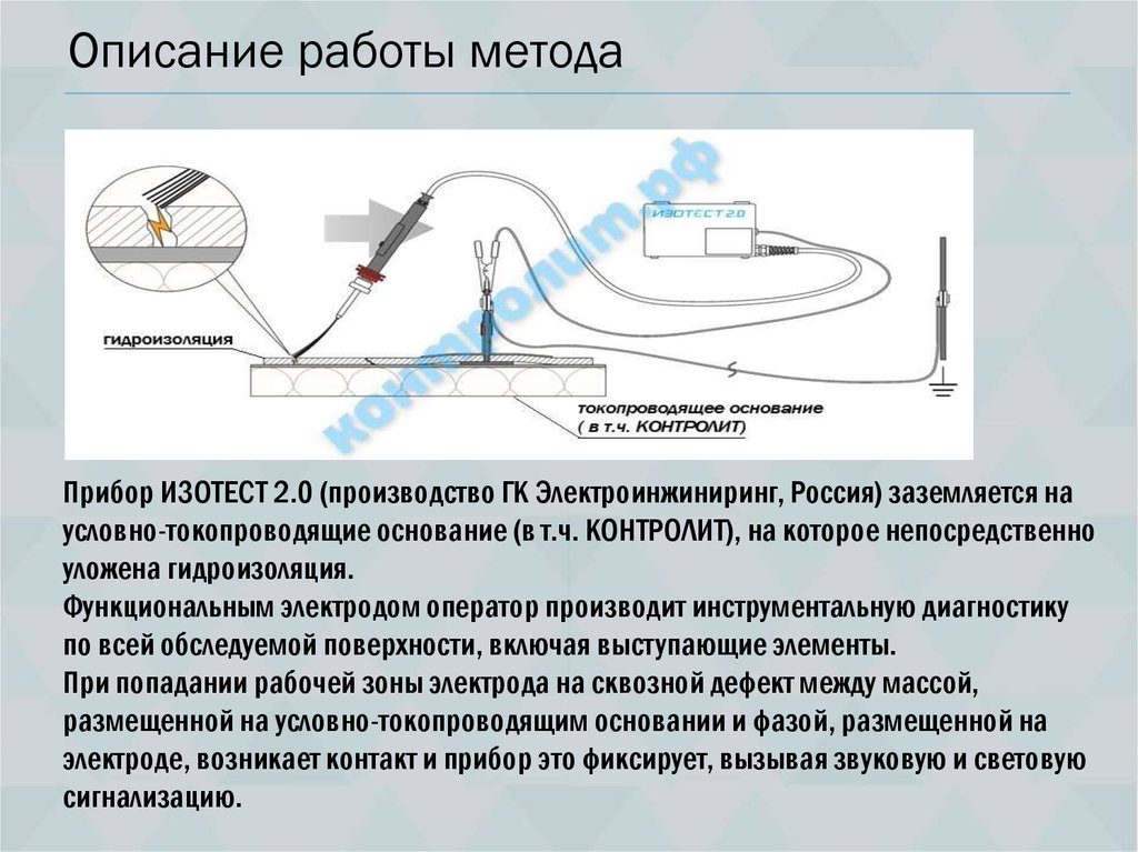 Описание работы методаПрибор ИЗОТЕСТ 2.0 (производство ГК Электроинжиниринг, Россия) заземляется на