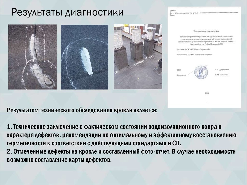 Результаты диагностикиРезультатом технического обследования кровли является: