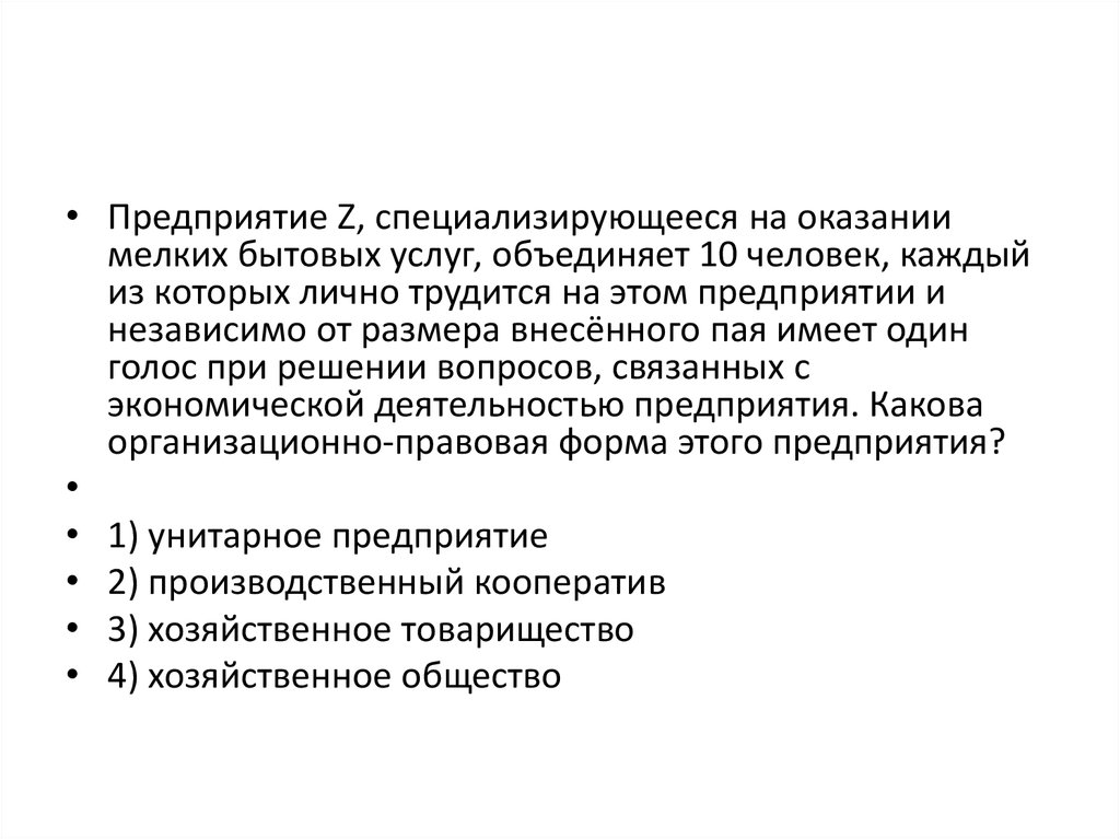 • Предприятие Z, специализирующееся на оказаниимелких бытовых услуг, объединяет 10 человек, каждый
