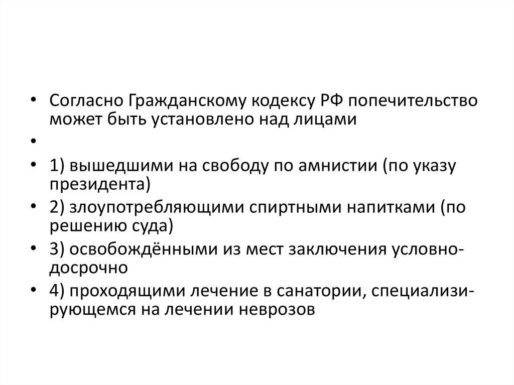 • Согласно Гражданскому кодексу РФ попечительствоможет быть установлено над лицами