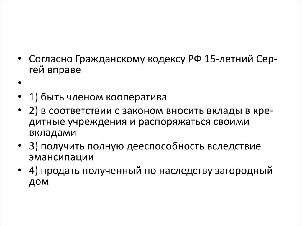 • Согласно Гражданскому кодексу РФ 15-летний Сергей вправе• 1) быть членом кооператива