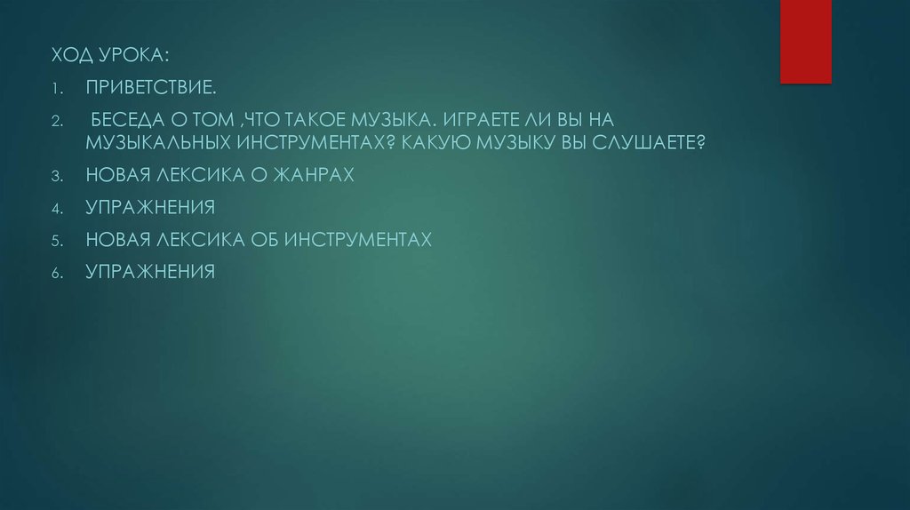 ТЕМА УРОКА:MUSICAL GENRES AND INSTRUMENTS