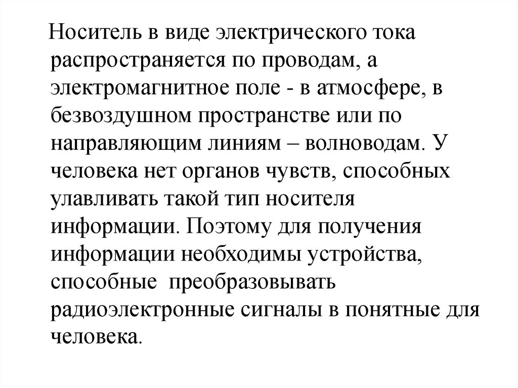 В радиоэлектронном канале носителеминформации является электрический ток и